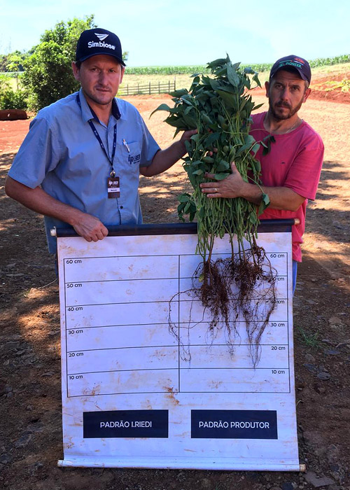 O produtor rural André Ricardo Denardin, do município paranaense de Braganey, obteve um acréscimo de oito sacas por hectare na cultura da soja com o uso do BiomaPhos. Ele utilizou o produto na última safra em dez hectares de soja, de um total de uma área cultivada de 360 hectares. “Essa área apresenta nível de média para alta fertilidade, na qual foi realizada a aplicação de calcário na fase de pré-plantio e carbonato de cálcio junto com o adubo na linha de plantio”, explica o produtor. Segundo ele, o kit de inoculação em sulco de plantio foi instalado na semeadora. “Além do aumento de produtividade, a análise de solo comprovou maior quantidade dos índices de fósforo disponível para a planta e maior desenvolvimento radicular”, aponta.